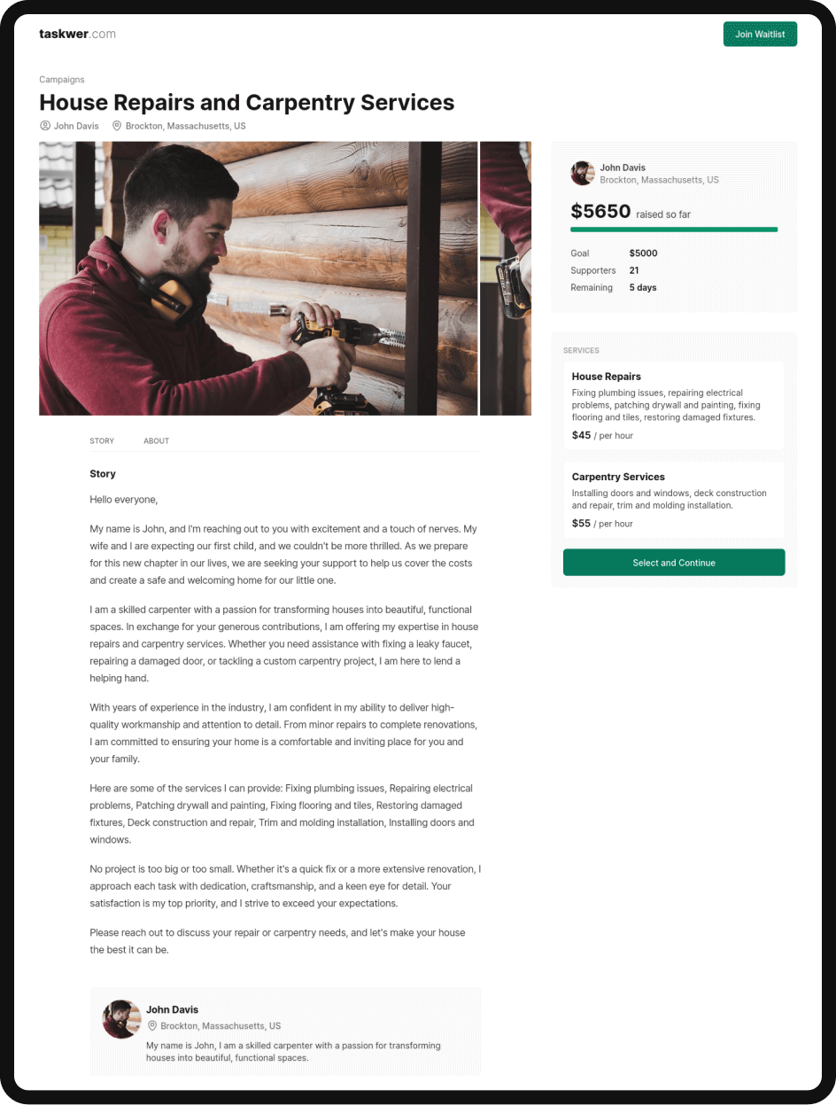 Taskwer allows you to raise funds for a wide range of personal goals, like education, business ventures, travel, art and more from your supporters. In return offer them services like babysitting, pet sitting, house repair, transportation or online services like web design, programming, and writing services.