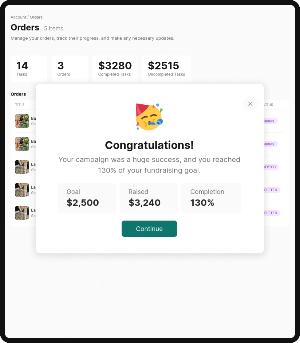 As soon as you launch your campaign, you can start receiving your first orders. Our Order Dashboard gives you a full overview of all your orders. You can easily talk with your supporters, discuss all the necessary details, and even create custom offers. And all that in one place.